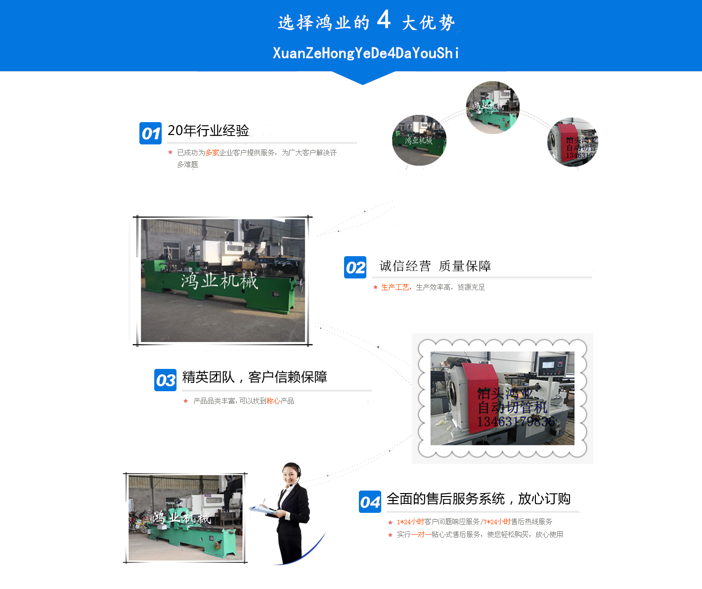 泊頭市鴻業(yè)機(jī)械金屬加工廠主要產(chǎn)品包括托輥雙端自動(dòng)焊接機(jī)床,托輥雙端自動(dòng)壓裝機(jī)床,鋼管自動(dòng)倒角切斷機(jī)床,托輥鋼管雙端自動(dòng)車(chē)孔機(jī)床,托輥鋼管雙頭車(chē)孔機(jī)床,托輥雙頭車(chē),加工托輥專(zhuān)用設(shè)備.根據(jù)用戶(hù)對(duì)工件加工、焊接的不同工藝及工序要求,設(shè)計(jì)專(zhuān)用機(jī)床是公司的 點(diǎn).本公司融合國(guó)內(nèi)外生產(chǎn)技術(shù),為廣大用戶(hù)提供科學(xué)性能優(yōu)良,質(zhì)量 的產(chǎn)品,我們擁有高素質(zhì)的員工隊(duì)伍,隨時(shí)為您提供服務(wù).